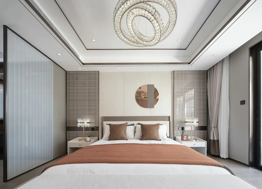 主卧采用理性的方格背景铺陈层次,赋予空间沉稳静谧的基调。而绚烂的灯饰又打破这一冷凝感,让整个空间充满跳脱的浪漫风情。焦糖卡其色系的床品,则提供着巧克力般的甜蜜氛围。