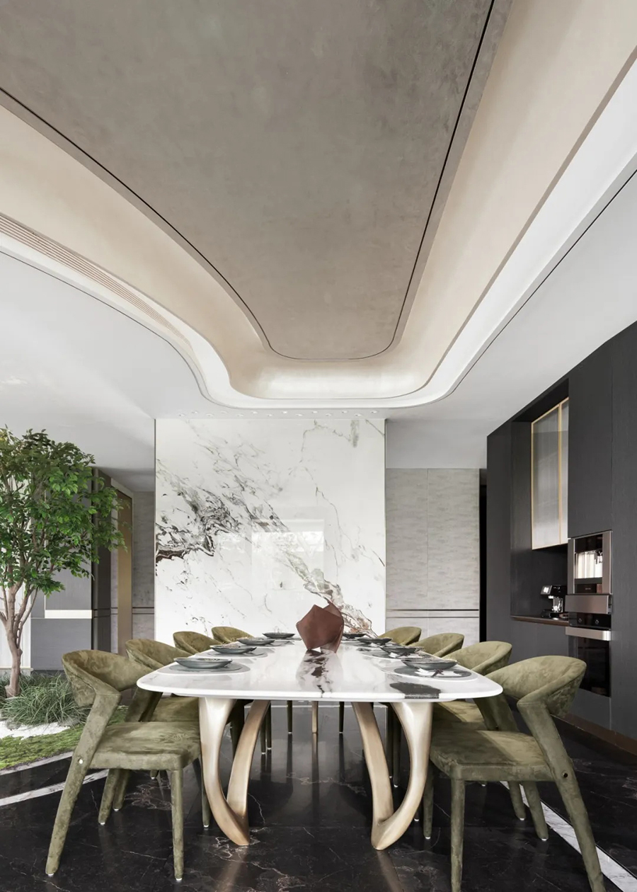 水墨溶于空间,客厅墙面的自由纹路向餐厅延伸,